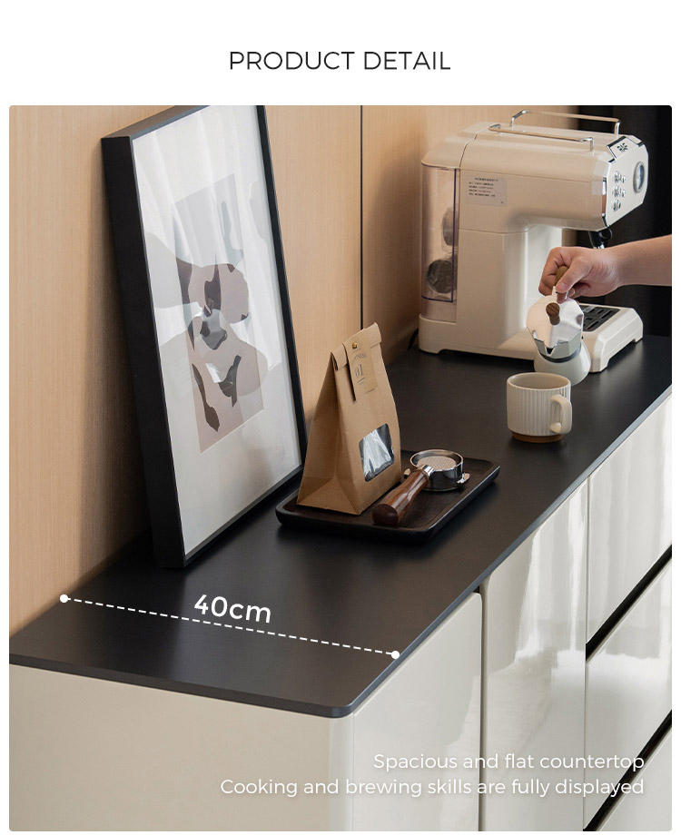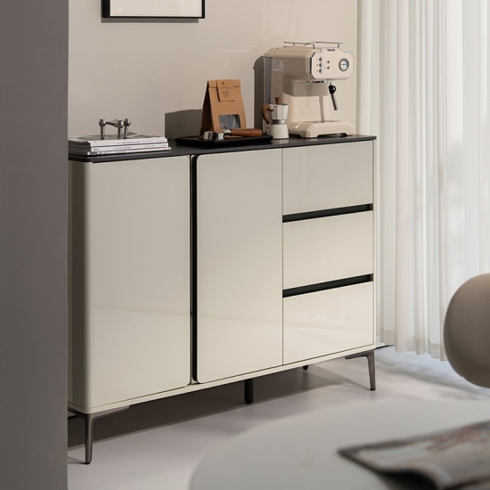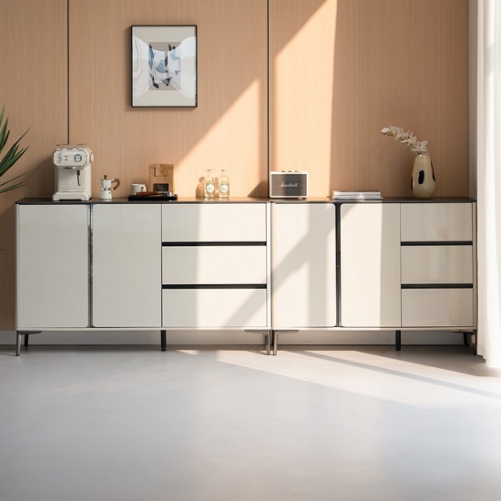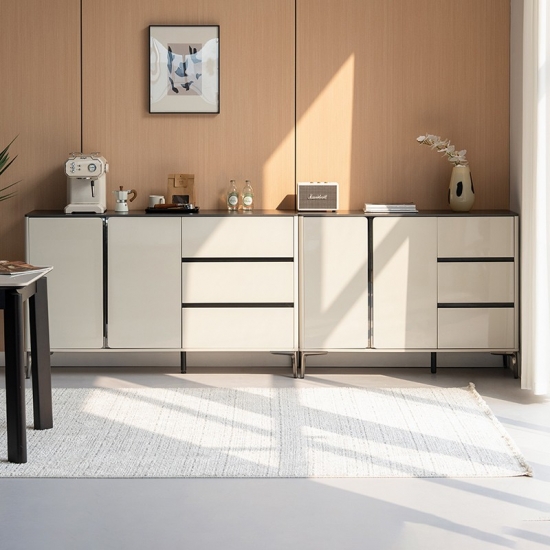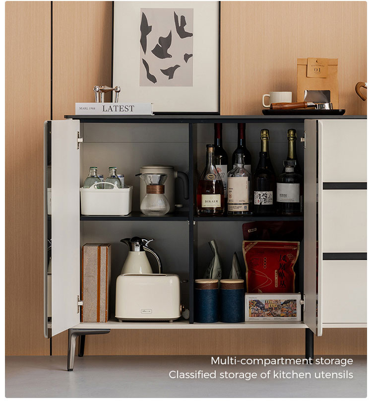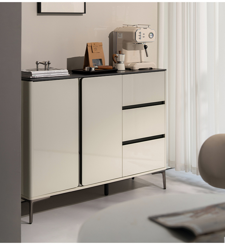 ارتقِ بمساحة طعامك مع هذه الخزانة الجانبية الفاخرة باللونين الأبيض والأسود، مزيج مثالي بين الأناقة العصرية ومساحة التخزين العملية. صُممت بعناية فائقة، وتتميز بتصميمها ثنائي اللون الرائع، بلمسة نهائية بيضاء لامعة مع لمسات سوداء غير لامعة، مما يخلق لمسة جمالية جريئة وخالدة.