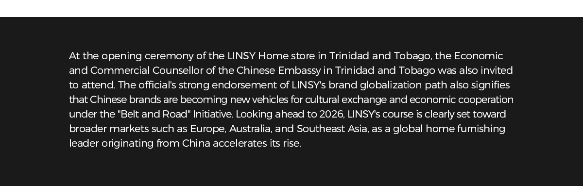 كانت ترينيداد وتوباغو، باقتصادها المستقر وثقافتها المتنوعة، خياراً ذا أولوية لشركة لينسي. افتتاح المتجر يسمح لـ LINSY بنقل نظامها البيئي بالكامل — يشمل ذلك جوهر العلامة التجارية المتمثل في "الموضة والتنوع والراحة"، وعمليات البيع بالتجزئة المتكاملة، وسلسلة التوريد الرقمية — في الخارج.