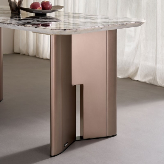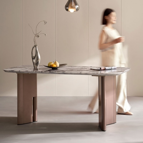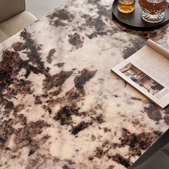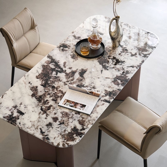 ارتقِ بتجربة تناول الطعام مع طاولة طعام LINSY الرخامية العصرية. صُممت هذه الطاولة بمهارة عالية، بسطح مستطيل أنيق، مصنوع من لوح واحد من الرخام الطبيعي، لتضفي لمسةً جماليةً على أي منزل عصري. تتميز كل قطعة بخطوطها الفريدة والعضوية، مما يضمن طاولتك فريدةً من نوعها.
