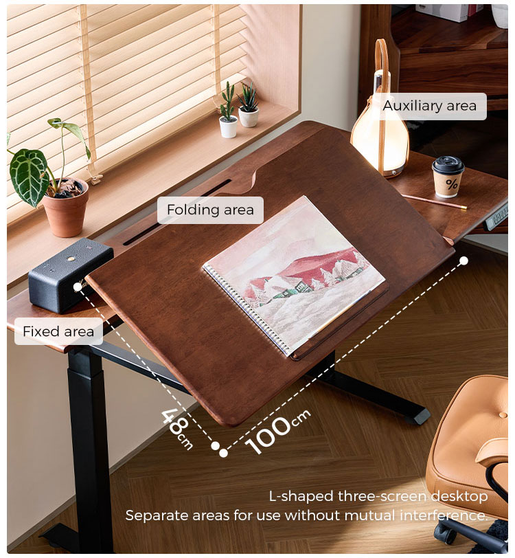 استمتع بمرونة فائقة مع مكتبنا الكهربائي القابل للتعديل. يمكنك ضبط ارتفاع مساحة عملك بسهولة بفضل محركه الهادئ. يضفي لونه الجوزي الدافئ لمسة جمالية طبيعية على أي غرفة، مما يعزز الراحة والإنتاجية طوال يومك.