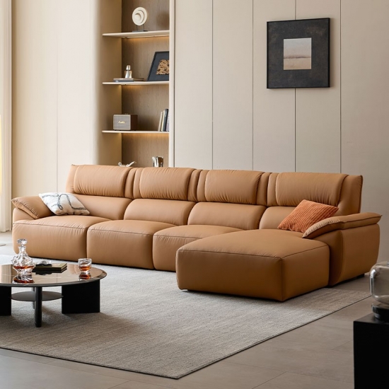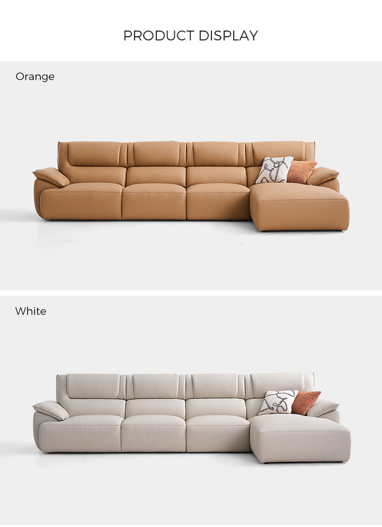 تنجيد برتقالي كهرماني نابض بالحياة: مصنوع من جلد أصلي فاخر أو جلد محبب عالي الجودة، تتميز هذه الأريكة بظل برتقالي كهرماني غني يضيف لمسة دافئة وحيوية ومتطورة من الألوان إلى أي غرفة.