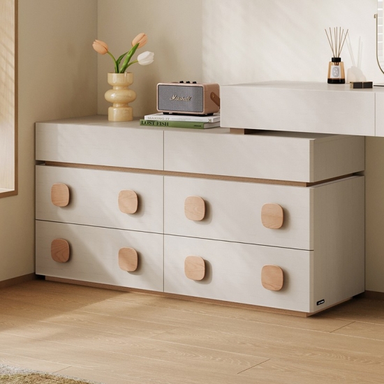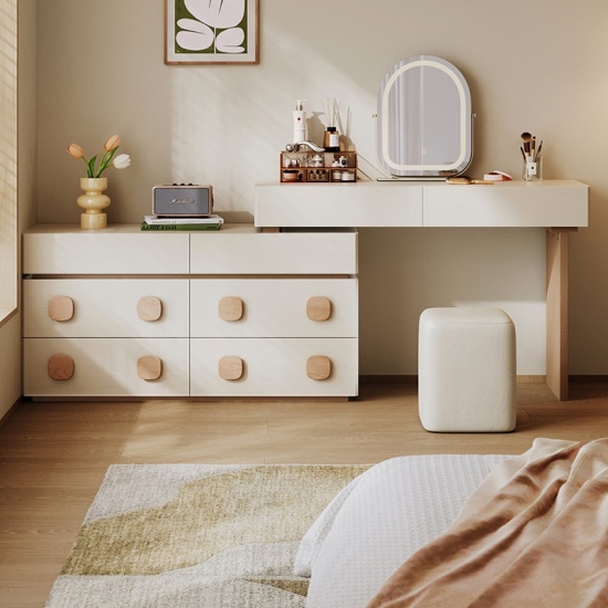 ارتقِ بروتينك اليومي وجمال غرفة نومك مع خزانة الملابس الرائعة بستة أدراج مع مرآة. تجمع هذه القطعة متعددة الاستخدامات بسلاسة بين مساحة تخزين واسعة، ووحدة تجميل مخصصة، وأناقة راقية. تتميز هذه الخزانة بستة أدراج انسيابية، وتوفر مساحة واسعة لتنظيم الملابس والإكسسوارات والبياضات ومستلزمات التجميل. حافظي على أغراضك مرتبة وسهلة الوصول إليها.